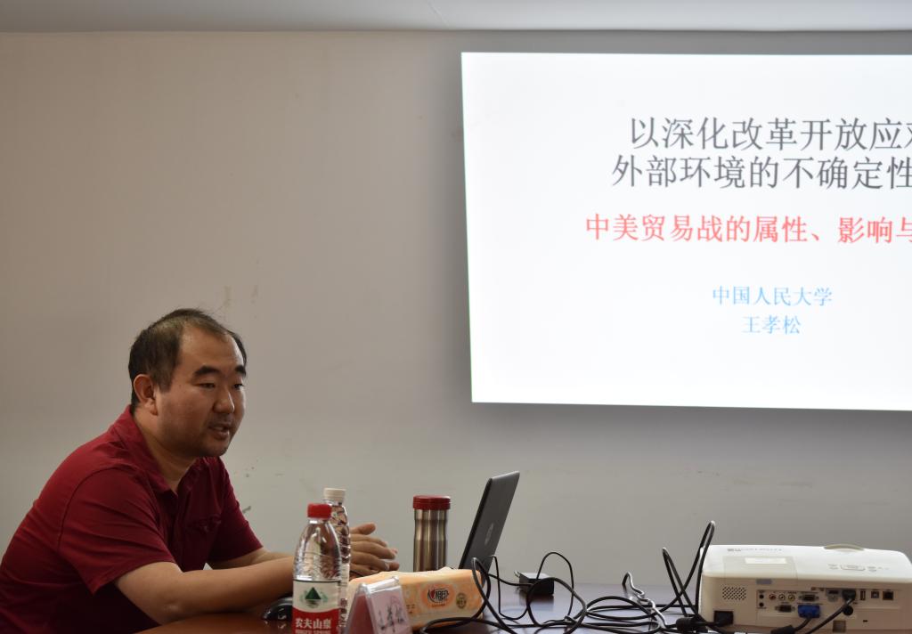 6月13日上午,财政税务学院第26期财税学术论坛在办公楼816举行。本期论坛邀请了中国人民大学王孝松教授做了题为《以深化改革开放应对外部环境的不确定性——中美贸易战的属性、影响与对策》的学术报告。研讨会由财政税务学院院长谢申祥教授主持,副院长马恩涛教授以及部分青年教师、博硕士研究生到场聆听。