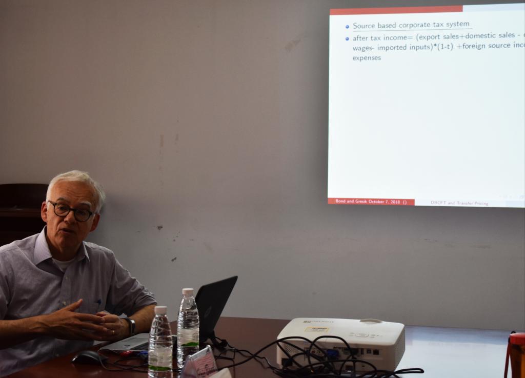 5月30日上午,财政税务学院第23期财税学术论坛在办公楼816举行。本期论坛邀请了美国范德堡大学经济系Eric Bond教授做了题为《Unilateral Tax Reform: Border Adjusted Taxes, Cash Flow Taxes, and Transfer Pricing》的学术报告。研讨会由财政税务学院院长谢申祥教授主持,副院长马恩涛教授、税收系系主任高凤勤教授、日本神户大学经营管理学院马岩教授以及部分青年教师、博硕士研究生到场聆听。报告会持续了近一个半小时,最后圆满结束。