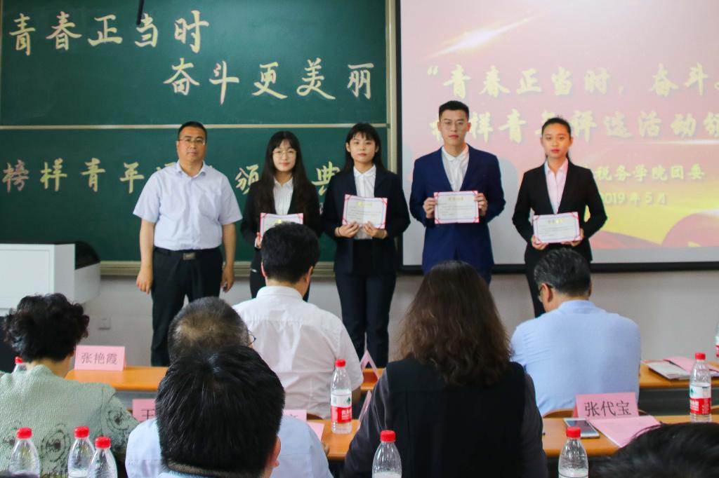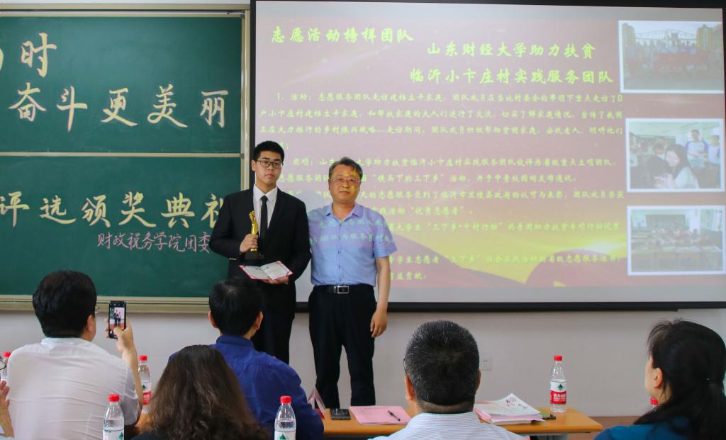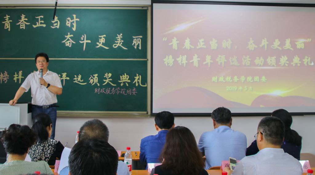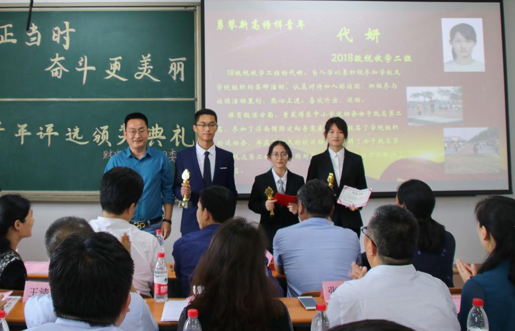 5月16日,财政税务学院第二届“青春正当时,奋斗更美丽”榜样青年评选活动颁奖典礼在圣井校区七号教学楼圆满举行。本次颁奖典礼由财政税务学院团委主办,财政税务学院学生会秘书处承办。出席本次活动的嘉宾有:山东财经大学就业指导处处长杨哲,山东财经大学党委学工部副部长张慧,山东财经大学团委副书记甘超,山东财经大学党委宣传部副部长张艳霞,山东财经大学教务处副处长孙德昌,财政税务学院院长谢申祥,财政税务学院党委副书记张代宝,财政税务学院办公室主任王清妍,财政税务学院财税实验室主任神方立,财政税务学院财政教研室副主任武彬,财政税务学院全体辅导员老师。财政税务学院学生会主席团成员、校学生会代表及各院学生会代表出席了本次颁奖典礼,2018级部分同学观看了本次典礼。