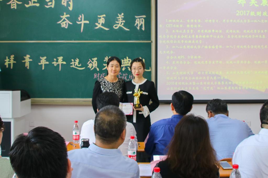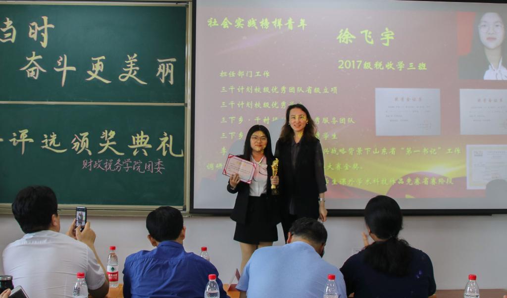 第九个颁发的是“宣传活动榜样青年”奖项,获奖者是2017级财政学六班的郑昊晨。坚持原创,坚持新闻第一线是她的原则,为学院宣传,做学院动态的传递者是她的初衷。她将带领财政税务学院学子以更加认真且专业的态度做好新媒体,将学院活动推进同学们的生活中。