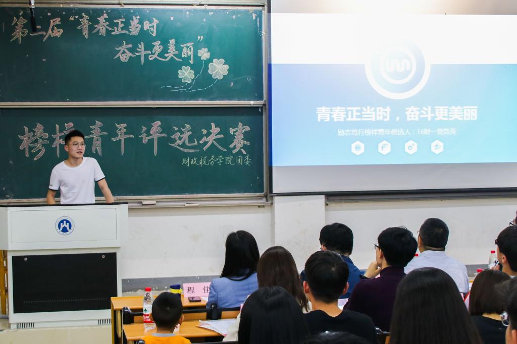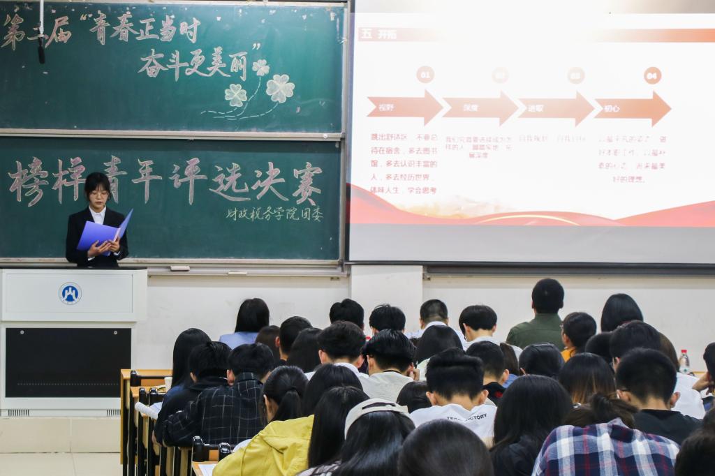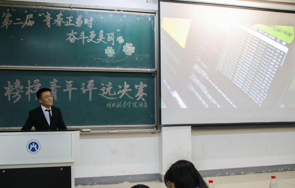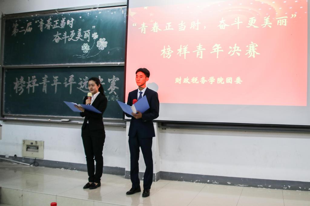 第四个上场的是博闻强识榜样青年候选人2016级税收学六班王雪萍和2017级财政学五班张文善。在认真学习校内课程的同时,他们广泛学习课外知识,并取得突出成绩。不仅如此,候选人们还广泛参加各类知识竞赛开拓自己的视野,掌握各类计算机软件应用来增强自身能力。他们认为在课余时间学习课外知识有利于自己增长见识,扩大知识面,对日后继续深造或是参加工作以后都具有重要意义。