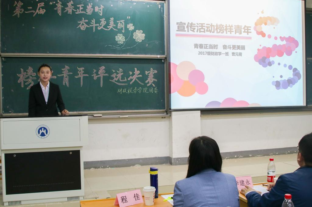 最后上场的是宣传活动榜样青年候选人2017级财政学六班郑昊晨和2017级财政学一班曹元荷。他们向观众们介绍了宣传工作对于学院的重要意义,以学院微信公众号等途径向同学们及时传递校园内的各类资讯,宣传学院文化。他们强调宣传工作是一种看似简单而又不简单的工作,在学院的建设中发挥着不可替代的巨大作用。