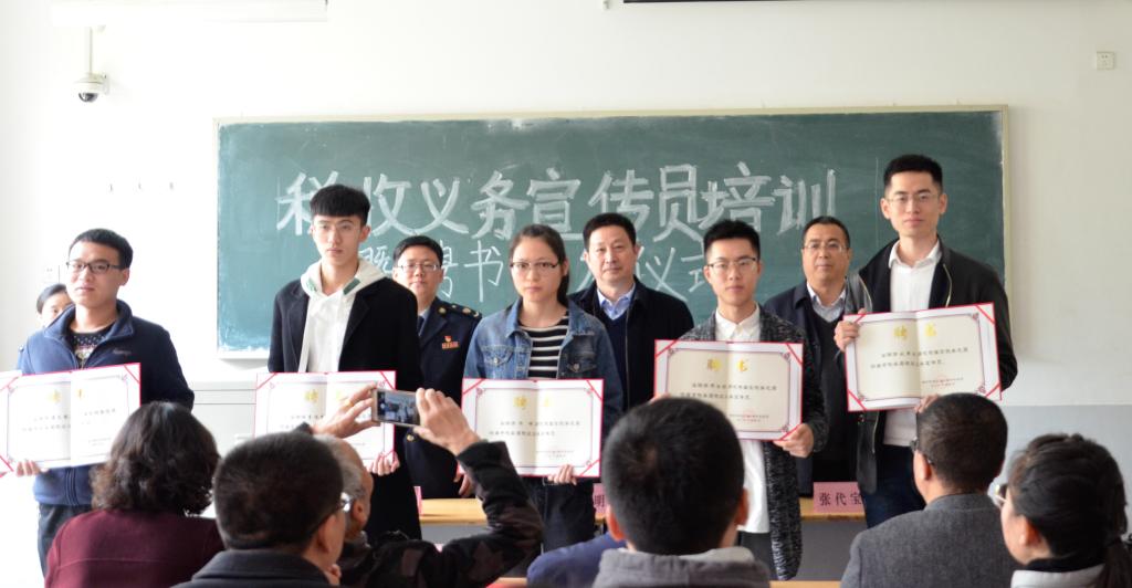 活动伊始,国家税务总局济南税务局办公室副主任高洪生介绍了出席本次活动的嘉宾,并对此次活动的聘书颁发仪式和税收义务宣传员培训两部分做出了说明。随后潘明星教授、张代宝副书记和高洪生副主任为二十名税收义务宣传员颁发聘任证书。