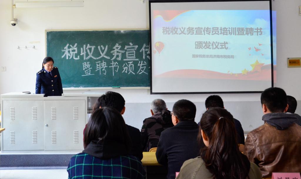 国家税务总局济南市税务局管慧年对本次税收义务宣传员进行培训。她将培训内容分为税收的介绍、如何成为税收义务宣传员及2019年的减税降费政策三个方面。管慧年老师首先详细地介绍了包括个人所得税、增值税、消费税、附加税等在内的主要税费种及征税对象。随后,她从宣传方式、宣传对象等方面讲解了如何从自身做起成为一名税收义务宣传员。最后她从多个方面讲解了中央经济工作会议提出的减税降费政策,并提到了政策所涉及的条件和影响。