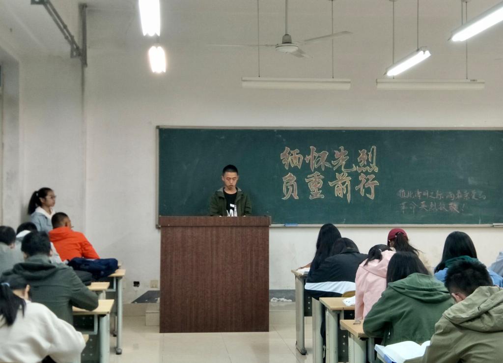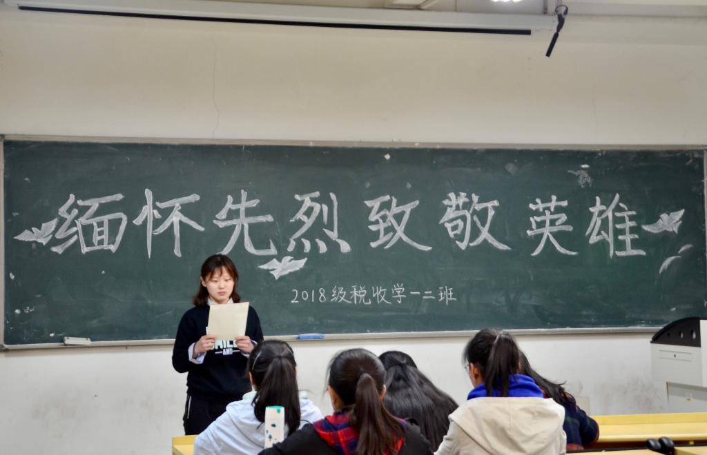 2018级各班以主题班会为依托,积极组织同学们利用课余时间绘制板报,每班推选2名学生代表进行主题演讲。演讲主题鲜明、感情真挚,频频引用先烈们的英雄事迹,例如面对敌人威逼利诱、残酷折磨仍大义凛然的杨闇公,不惜千金买宝刀的秋瑾。一寸山河一寸血,一抔热土一抔魂。学生代表们慷慨激昂的演讲在激励同学们向先辈学习、矢志成才报国的同时,也使财税学子们对革命先烈忠贞不渝的爱国精神有了更加深切地体会。各班级结合本班特色,以共唱红歌、诗歌朗诵、自由发言等形式向革命先辈表达敬仰之情。