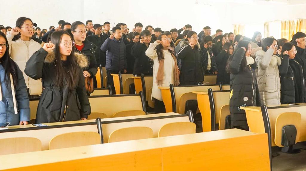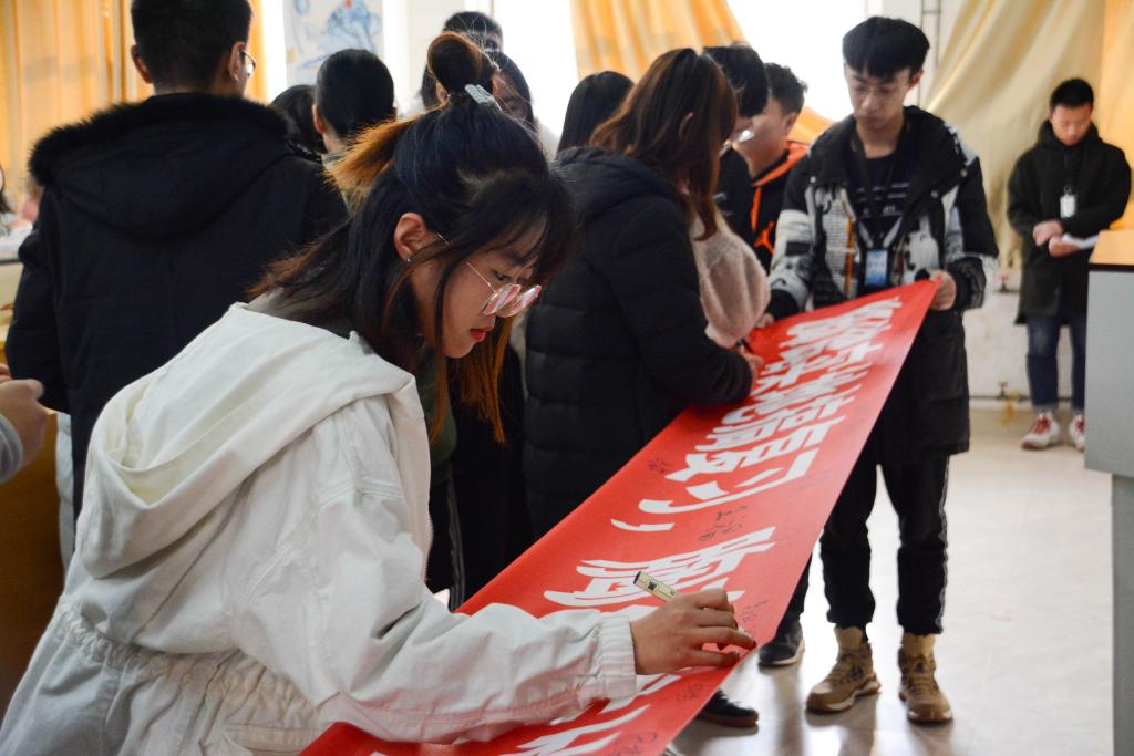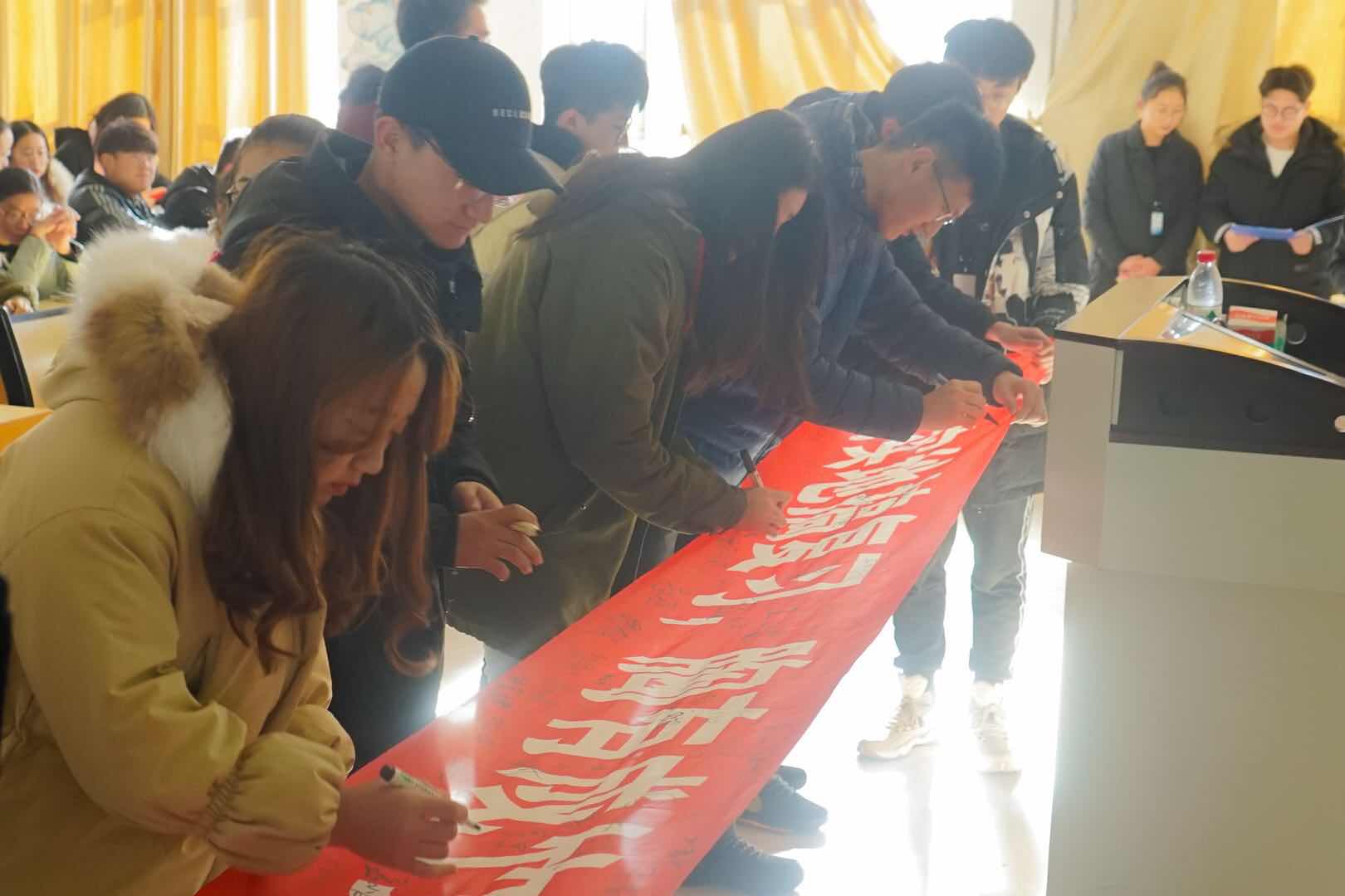 大会最后,各班同学代表有序上台,在“脚踏实地搞复习,胸有成竹迎挑战”的横幅上签字。考评委助理带领全体同学进行庄严宣誓,在同学们铿锵有力的宣誓声中,本次大会圆满落下帷幕。本次大会的举办,增加了财税学子积极备考的信心,激发了财税学子的学习热情。
