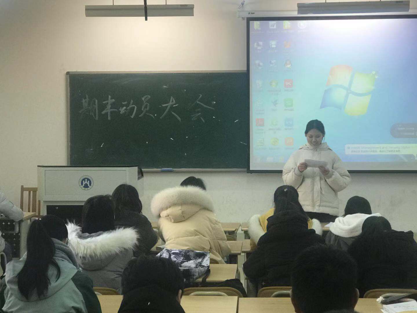 李峻汝老师着重强调了同学之间互帮互助的巨大作用,她建议同学们加强学习方面的沟通交流,取长补短,共同进步,同时提醒同学们要学会利用平时课下的宝贵时间,不虚度光阴。至于考试纪律,她告诫同学们要诚信考试,严以律己,坚决杜绝作弊现象的出现。接着,李老师对同学们过度玩手机的现象提出了批评,她表示同学们应适当游戏,把主要的精力投入到学习中,加强基础学科的学习。寒假将至,李老师提醒同学们要注意假期内出行和走亲访友时的人身安全。最后,李老师向同学们的期末考试送上祝福,祝同学们在考试中发挥出自己的最高水平,拿到令自己满意的成绩。