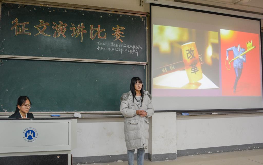 12月7日,“观改革浪潮,看经济腾飞,争做财税先行人”征文演讲比赛决赛在圣井校区明德楼圆满举行。本次比赛由财政税务学院主办,学生会大学生创新实践中心专业拓展部承办。比赛评委有:创新实践中心社会实践部徐飞宇、朱微星,创新实践中心策划部孙欣、陈恺忻,创新实践中心秘书处段思若、吕文龙,创新实践中心调研部王梦琦、王佳慧,创新实践中心学术竞赛部于睿希、易静,创新实践中心专业拓展部李琳。2017级、2018级部分学生观看了本次比赛。