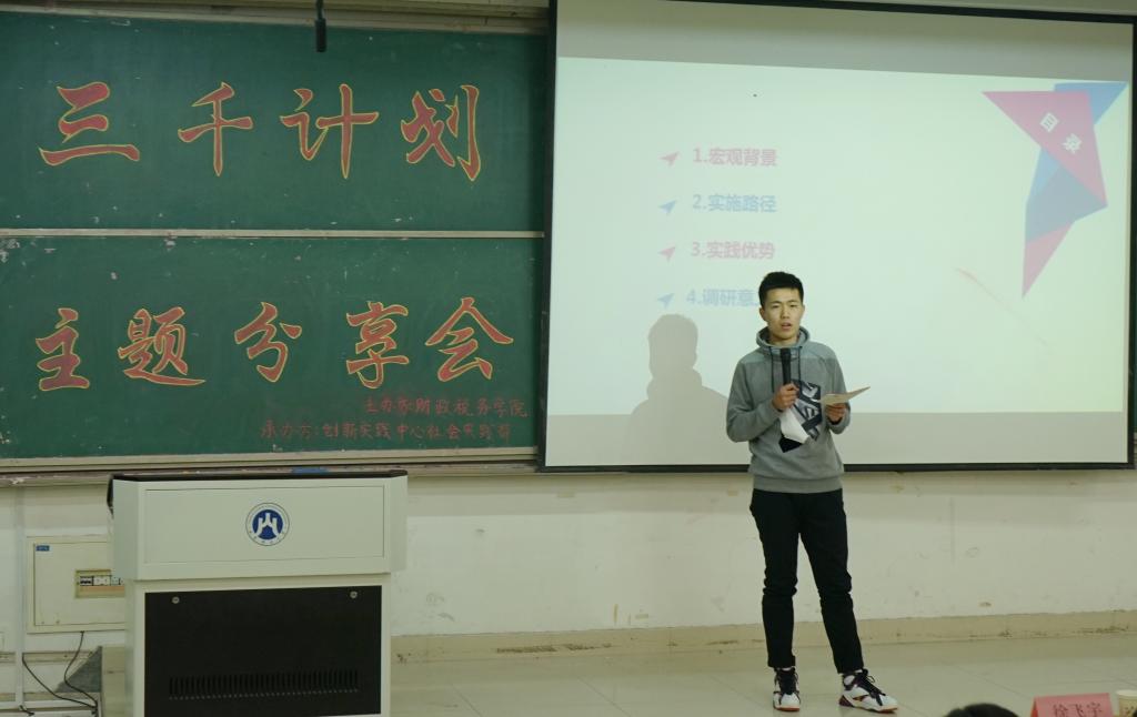 11月17日,财政税务学院2018年社会实践“三千计划”第三场主题分享会在圣井校区敏行楼圆满举行。这次活动由财政税务学院主办,学生会创新实践中心社会实践部承办。本次主题分享会不仅邀请了徐飞宇、王靖童、温熙霖、孙景钊、孟庆昊五位2017级优秀学生代表,还邀请了财政税务学院副院长马恩涛。2018级部分同学参加了此次大会。