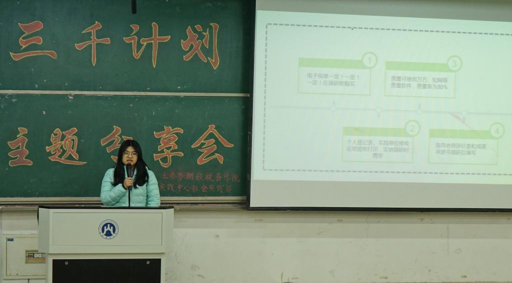 最后财政税务学院副院长马恩涛对本次分享会做出总结发言。他认为每一组分享都很精彩。每一组的分享从不同侧重点出发,有助于新生对“三千计划”活动的了解。他阐述了实践的重要性,认为同学们在社会实践中应提前做好充分准备,多学多看多问,从多方面获得知识。最后马恩涛副院长祝愿明年“三千计划”社会实践调研能取得更优异的成绩。