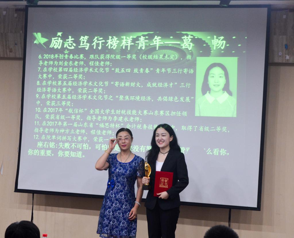 首先颁发的是“励志笃行榜样青年”奖项。经过评选,2015级税收学一班的葛畅获得此奖项。在她制作的个人视频中,葛畅同学向同学们介绍了自己的个人经历和曾获得的荣誉奖项,并建议同学们好好学习、积极参加竞赛和实践,以良好的心态取得优异的成绩。2015级财政学七班的李敏获得了“敬业敏学榜样青年”奖项。主持人对李敏进行了简单的采访。作为“敬业敏学榜样青年”,她谈到,“敬业”是指同学们在工作中要有责任心,“敏学”则是要求同学们努力学习,工作和学习并重才能全面发展。