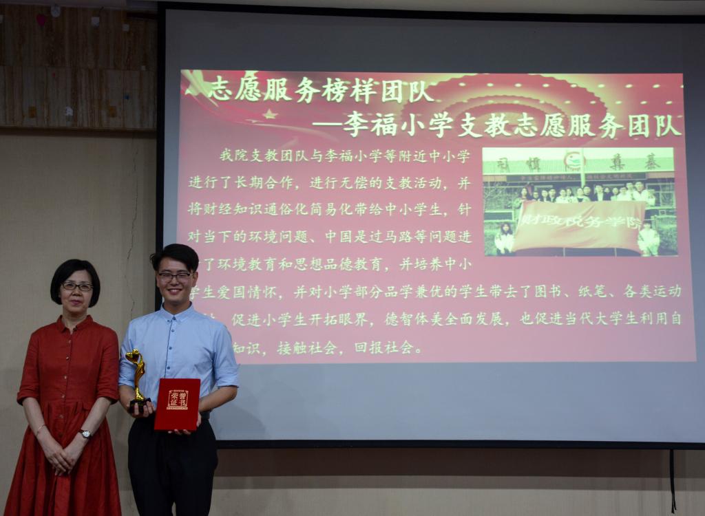 随后,李福小学支教志愿服务团队获得“志愿服务榜样团队”奖项。李福小学支教活动由学生会社团部承办,多年来他们坚持参与校内外的志愿公益活动,尽自己所能为他人、社会提供献爱心活动,并以实际行动感染了周围同学,获得了老师、同学们的肯定。接下来颁发的是“校园文化榜样青年”奖项,获奖者为2015级税收学六班的王宏瑞,他积极参与并组织了各项艺术活动,在文体活动中起到了良好的模范带头作用,在丰富同学们课余生活的同时也提高了自己。第八项颁发的是“宣传活动榜样青年”奖项。获奖者是2016级税收学四班的李秋月,她在个人视频中表达了对宣传的热爱和她将带领新媒体中心所有成员以更加努力且专业的态度做好宣传工作的决心。