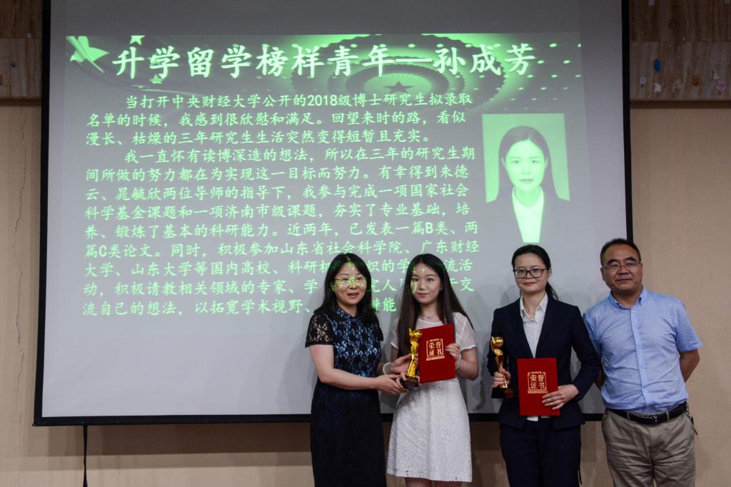 接着,“升学留学榜样青年”奖项由2015级财政学硕士孙成芳和2014级税收学六班刘晨阳获得,她们带着新时代青年的希望,靠自己辛勤的劳动换来优异的成绩。她们学有品位,学有成就,用行动践行了自己的诺言。最后一个奖项是“就业先锋榜样青年”奖项,2014级财政学三班的胡钦雷获得了 “就业先锋榜样青年”奖项。他坚信“他山之石,可以攻玉”,他用实际行动证明了他所奉行的宗旨“选好岗,稳住心,做自己”,用学识与素养打造辉煌的人生。