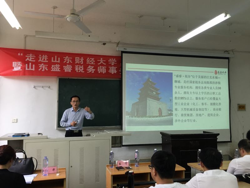 4月21日,我院联合山东盛睿税务师事务所开展了“走进山东财经大学,畅想现代税收未来暨山东盛睿税务师事务所校园税法宣传”活动。学院党委副书记张代宝,税收教研室神方立老师、郭健老师、张春燕老师、孙红霞老师,山东大学经济学院李华教授,山东盛睿税务师事务所王宁主任,北京一法律师事务所税法部副主任刘金涛,中瑞国际税务集团高级税务经理高勇出席活动。学院舜耕校区2014级、2015级本科生及硕士研究生参加了本次活动,学院团委书记王正一主持本次活动。