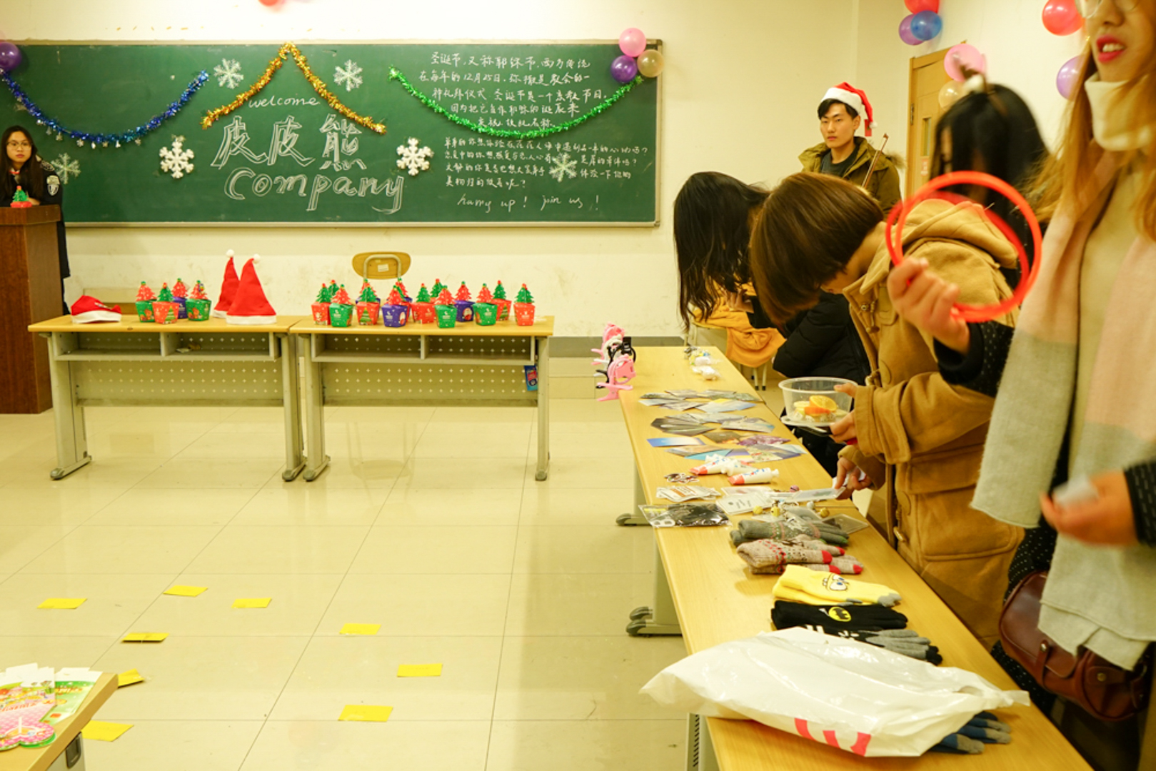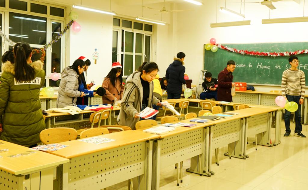 12月24日,最激动人心的第四环节—销售产品环节终于到来,各团队精心布置会场,等待顾客们的到来。下午五点左右,营业正式开始,一时间各摊位宾客盈门。令人垂涎欲滴的蛇果、可爱的跳跳蛙、承载梦想的竹蜻蜓、记载心情的明信片……琳琅满目的商品令人目不暇接,风格各异的主题带领同学们走进丰富多彩的世界。队员们热情地为顾客们介绍自己公司的商品。现场小提琴演奏点燃了顾客们的消费热情,更有穿着玩偶服装的队员与顾客拍照留念,增进了公司与顾客之间的交流。第四环节在顾客们的大加赞赏中结束。营业结束后,大会将通过计算各团队的所获顾客票数进行评选。