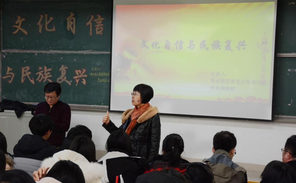12月22日,财政税务学院“文化自信与民族复兴”讲座于圣井校区敏行楼圆满举行。本次讲座由山东财经大学财政税务学院主办,学生会秘书处承办。此次讲座由明水校区管委会党委书记李永刚教授担任主讲人,财政税务学院党委副书记梅丽萍、2017级税收学辅导员李建永老师出席了本次讲座。2017级部分学生参加了此次讲座。