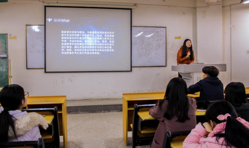 薛一帆,成功推免进入山东大学,任班级学生干部、博观创客空间会长等职务,获国家奖学金。她以“保研是什么”、“保研流程”、“保研经历”、“保研感悟”以及“展望与期望”详细讲解,她表示,机会是留给有准备的人,要敢于尝试、敢于挑战,对自己要有信心,对于自己的目标要尽早做打算,时间尽早不尽晚,要在正确的时间做正确的事情。她将自身的保研经历悉心讲述,希望同学们能吸取经验,创造奇迹。