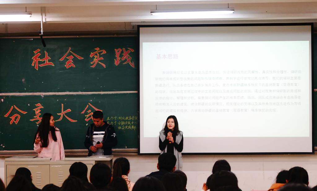 新疆基础教育精准扶贫问题调研团队的迪丽努尔•艾海提、沈姝玉、木合塔尔•吐尔孙向大家分享了调研的经验与心得。他们认为扶贫首先要扶智,加强基础教育并培养创新型人才才是脱贫致富的根本。沈姝玉表示学生亲身加入到社会实践当中有助于自身综合素质的提高,理论与实践的统一才能造就优秀的新生代大学生。