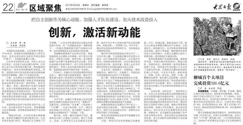 □ 杜文景 郭 健 汪崇金 汤长胜 实现新旧动能转换,山东被寄予厚望。今年4月末,我省新旧动能转换重大工程正式启动,成为全省经济社会转型升级发展的“牛鼻子”,而创新则是重中之重。 山东作为全国经济大省,传统工业行业实力突出,占全省工业的比重约为70%,但传统工业产业中的科技含量不高、附加值低的问题突出,经济发展的弊端较为明显。同时,创新能力的不足也使省内新旧动能转换的后发优势稀缺,制约了产业转型升级。 日前,山东财经大学财政税务学院组建的“新旧动能转换背景下财政支持高端装备制造业转型升级发展”调研团队,前往济宁、烟台、青岛、潍坊等8个市进行实地调研,涉及七类高端装备制造业领域,针对全省装备制造业发展现状和在“新旧动能转换”背景下财政支持装备制造业转型升级的实践成果及具体落实状况,探寻财政支持在企业转型升级中所发挥的基本作用与外延功能。 装备制造业是济宁的传统支柱产业。近年来,该市着力优化产业结构,多渠道破解企业发展难题,加快推进装备制造产业向高端迈进。 “刚起步阶段,产品研发确实困难重重,很多的关键技术在国内都是空白。引进外国专家进行指导,帮助我们大大缩短了开发周期。”山东永华机械有限公司副总经理范磊介绍说,在“中国制造2025”战略背景下,一些重点领域将提升国产设备的占有率,这对装备制造企业来说是很大的机遇。 为破解装备制造产业结构不合理,高端装备制造占比重较小的难题,济宁着力引智借力、不断自主创新,拓宽市场、努力提高高端产品在整个装备制造业所占比重。在新旧动能转化的新形势下,济宁市作为典型资源型城市,传统工业的发展优势没有完全体现,装备制造业转型升级有待进一步加快。 7月24日,在烟台市发改委协调组织的座谈会上,烟台杰瑞石油服务集团、烟台市中集来福士海洋工程有限公司和烟台台海德尔玛核电设备股份有限公司等6个市重点装备制造企业负责人就当前企业转型升级过程中政府与市场的责任分担问题进行了探讨,认为政府和市场的经济关系应该是“市场为主导,政府是企业的后备力量”,这一观点也从侧面印证了财政政策在装备制造业转型升级中所发挥的作用。 今年年初,由烟台中集来福士总承包建造的全球最先进超深水钻井平台“蓝鲸1号”名震全球。这座科技“含金量”十足的海上“巨无霸”,从设计到采购、生产、调试全部由来福士公司完成,是中国船厂在海洋工程超深水领域的首个“交钥匙”工程。 据介绍,目前,烟台已建成开发区、蓬莱和龙口湾三大造船工业园区,集中了来福士、京鲁、巨涛等龙头企业及配套企业集群,海洋平台订单占全球同类产品市场份额25%,居国内第一、世界第三位。今年年内,烟台将完成技改投资1600亿元,力促制造业实现转型升级。 烟台作为我省装备制造业领头羊之一,实力不容小觑,工业规模总量位居全国大中城市、14个首批沿海开放城市、山东省17市前列。培育新动能的同时,还应注重传统动能的改造升级,盘活存量,推进工业成为支撑全市经济社会发展名副其实的主力军。 立足实际、把握重点、因地制宜,潍坊盛瑞传动、福田汽车、天瑞重工、华滋自动化等装备制造企业进行了许多探索。 据了解,为推进高端装备制造业发展,潍坊市去年出台了高端装备制造产业基地发展规划,规划到2020年全市装备制造产业规模以上企业完成工业增加值1200亿元,年均增长9.8%;实现主营业务收入6000亿元,年均增长10%;实现利润430亿元,实现利税600亿元。通过转变装备制造产业发展方式,培育强高端装备制造产业和重点企业,争创高端装备制造产业自主创新示范区,打造环渤海地区重要的高端装备制造产业基地。 高端装备制造业是潍坊主导产业之一,目前呈稳步发展态势。“新旧动能转换”背景下,政府与企业的通力合作,为潍坊企业转型升级打下良好基础。 青岛市的装备制造业转型升级道路为全省提供了许多借鉴。 目前,青岛市已初步构建起以机械装备、汽车、轨道交通、船舶及海洋工程、航空五大板块为重要支撑点的产业格局,以高速动车、新能源汽车、风力和核电等新能源发电装备、海洋工程装备、精密数控机床作为切入点和突破口,在重大关键核心技术上取得突破,逐步提高自主制造比例。 青岛机械装备产业逐渐向高端、智能转型升级,目前已拥有软控股份、捷能汽轮机、科捷自动化、特锐德等一批具有影响力的骨干企业,特别是近年来机器人产业又有了突破式的发展,在高新区设置的青岛国际机器人产业园,日本安川电机、新松机器人、科捷、宝佳、诺力达、创想、汇智、速霸数控设备等一批机器人项目落地,2014年青岛市获批科技部颁发的“青岛国家机器人高新技术产业化基地”称号,这是国内获批的首家以机器人产业为特色的高新技术产业化基地。 “立足结果,分析总结”,调研团队认为,未来山东省在推进新旧动能转换进程中必须采取更加踏实积极的举措,全力以赴推进项目落实,尤其是要发挥大中型企业作为新旧动能转换项目落实的标杆作用,要坚持把自主创新作为核心动能,着眼市场需求的前沿领域,加强人才队伍建设,加大技术改造投入。各行业龙头企业更要发挥自身优势、积极作为,在实施新旧动能转换工作中发挥引领带头作用,加快实现企业创新性转型发展,为山东