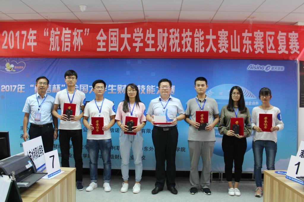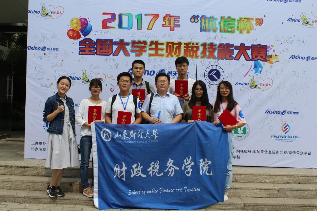 2017年9月21日至22日,由财政税务学院2015级财政学七班丁文文、税收学三班程露、税收学三班祝秋思、税收学四班张同兆、税收学四班赵晓琴、税收学五班宋晖六位同学组成的山东财经大学代表队在指导老师李建永的带领下前往日照参加2017年“航信杯”财税技能大赛山东赛区复赛,学院大学生创新实践中心素质拓展部部长葛畅同学担任领队。经过激烈的角逐山东财经大学代表队最终夺得大赛一等奖,顺利晋级11月份“航信杯”全国大学生财税技能大赛总决赛。