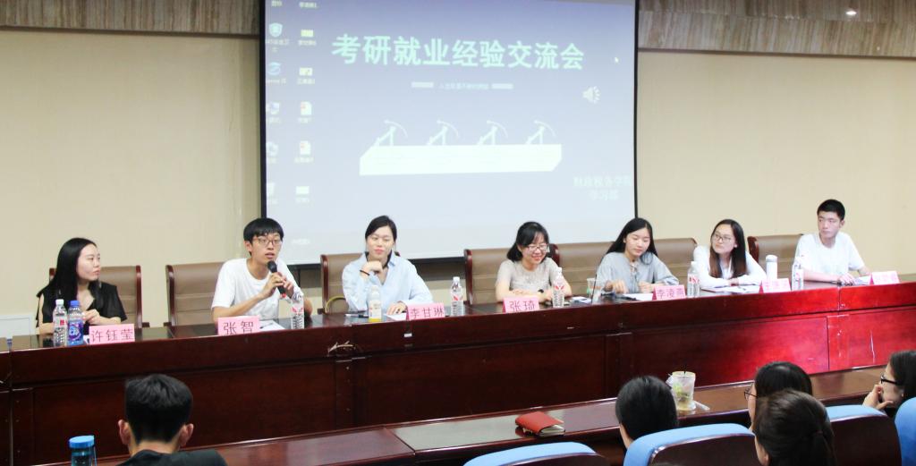 5月11日,财政税务学院2017年考研就业经验交流会于圣井校区敏行楼顺利举行。本次交流会由山东财经大学财政税务学院主办,学生会学习部承办。在研究生入学考试中取得优异成绩和在就业竞争中脱颖而出的2013级学生张智、赵聪睿、王潇涵、李凌燕、许钰莹、张琦、李甘琳受邀参加本次交流会,向同学们分享宝贵的考研就业经验。2015、2016级部分同学聆听了此次经验交流会。