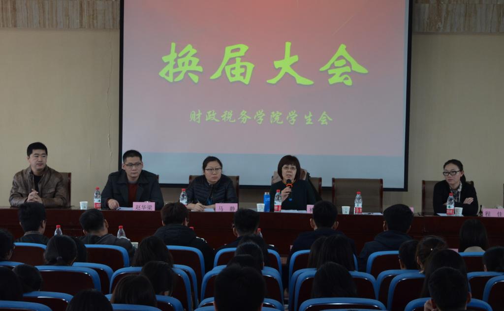 3月2日,财政税务学院学生会换届大会于圣井校区敏行楼圆满举行。本次学生会换届大会由财政税务学院主办,学生会秘书处承办。出席本次换届大会的领导老师有:财政税务学院党委副书记梅丽萍,学院团委书记王正一,2015级辅导员老师马静、程佳。出席本次会议的学生代表有:2014级学生会主席赵华梁,2015级全体学生会成员以及2016级全体学生会成员、各班班委。