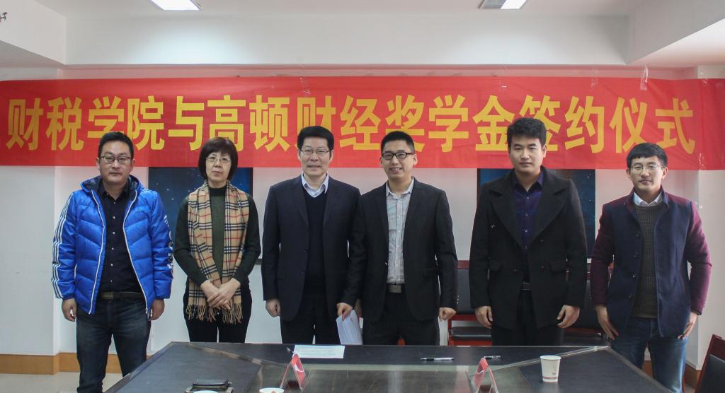 为落实学校就业工作推进会精神,拓宽学生的财经视野,丰富毕业生的就业途径,2016年12月26日上午,山东财经大学财政税务学院与高顿财经奖学金签约仪式在山东财经大学舜耕校区举行。财政税务学院党委书记李玉成、党委副书记梅丽萍、学院就业办主任曹同锋,高顿财经济南分校市场部经理孟光等出席签约仪式。