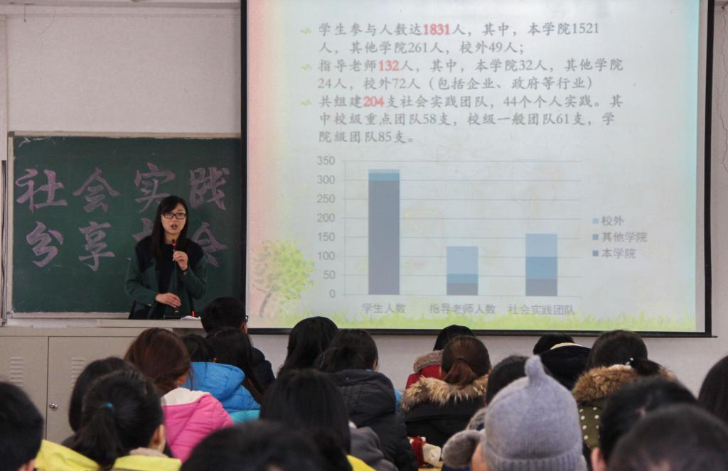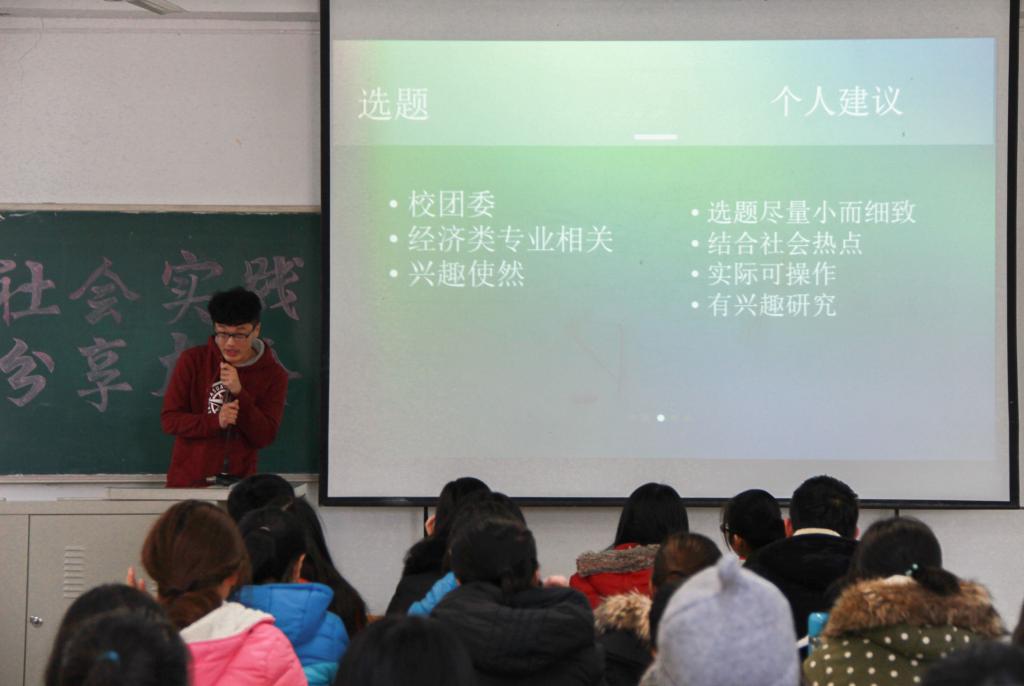 11月23日,财政税务学院“社会实践分享大会”于圣井校区敏行楼圆满举行。本次大会由财政税务学院主办,学生会创新实践中心社会实践部承办。2015级辅导员程佳老师参加此次会议。分享会邀请了优秀社会实践团队的成员,2015级徐长拓、邵义宾、管木荣、刘婷婷四位优秀学生代表。2016级部分学生聆听了此次大会。
