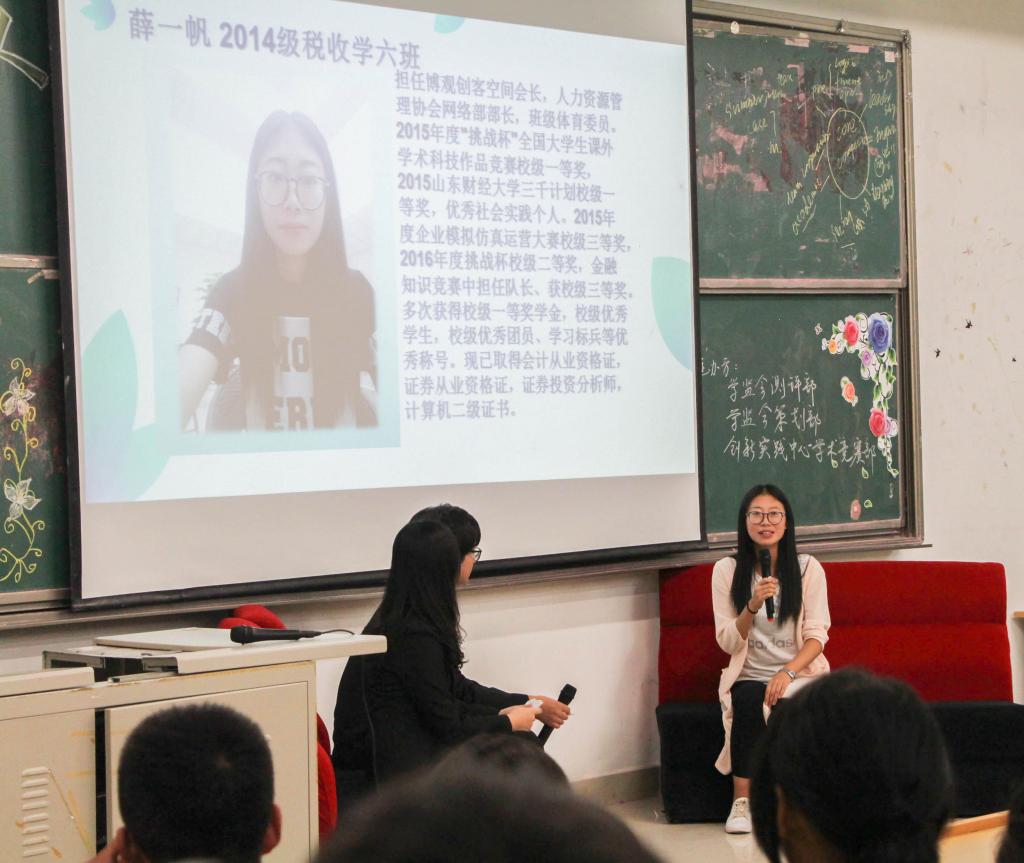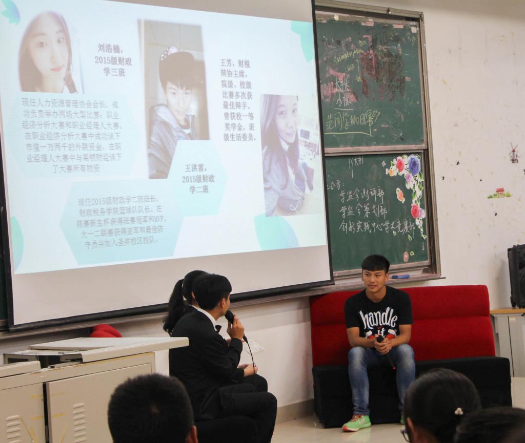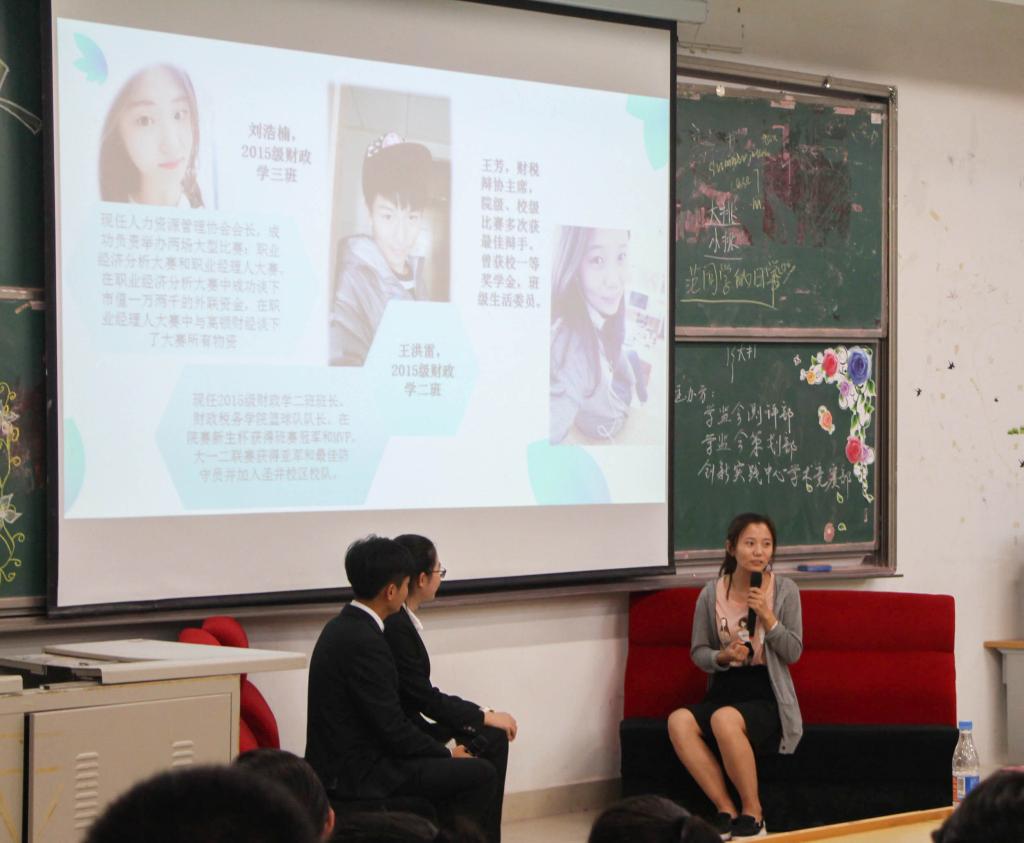 访谈以各位主讲人的亲友团采访视频开场,以访谈形式向新生传达经验。张泽祯,有论文刊载于《南方经济》,曾获国家励志奖学金等多项荣誉并于2016年暑期在普华永道实习,凭借丰富的实习经历向2016级新生介绍了在大学四年所应培养的能力以应对找工作的需求。他强调了要多方面发展自己,在玩中学,做自己想做的事情。范佳慧,中共党员,财政税务学院党支部负责人,一再对新生强调大学期间学习的重要性,大学一年级新生需要努力去适应大学生活。薛一帆,担任博观创客空间会长,分别在学习、社会实践、挑战杯三个方面进行讲解并对新生提出建议,“只有去尝试,才能去体会其中的乐趣与用处”,鼓励新生去积极参加活动,勇敢尝试,去实现自我价值。互动环节中,三位优秀代表耐心解答新生疑惑。幽默的语言,丰富的经验,赢得在场观众的阵阵掌声。