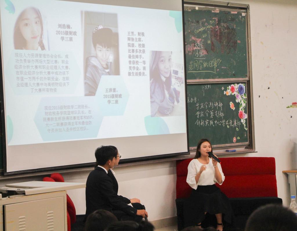 最后,财税学院篮球队队长王洪雷向新生分享我院的篮球比赛情况,呈现出 “因为热爱所以存在”这一青春主题。王芳向大家分享了自己在学院辩论协会中的收获,让大家感受到辩论的魅力。刘浩楠作为学校大学生社团“人力资源管理协会”的会长,给出新生选择社团要“在精而不在多”的建议。