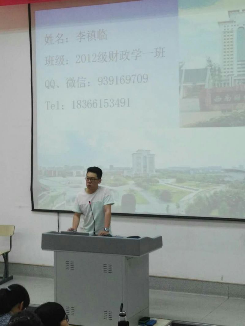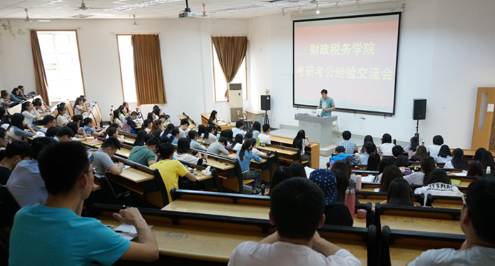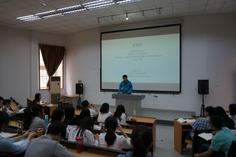 郭亚坤,考取上海财经大学,她从自身经验出发给同学们讲述了具体学科的具体学习方法,并提醒同学们要按部就班地坚持自己的计划,不要过分在意外界的说法。她分享自己的座右铭与同学们共勉:“就算只考上一个,那个人也会是你。”成功考取中央财经大学的王程祥强调,在考试之前明确考试目标并为之坚持地付诸努力是能否成功的关键。考取东北财经大学的胡玥与考取西南财经大学的李禛临与大家分享了考研一路走来的艰辛,他们以亲身经历告诫财税学子:当你遇到挫折的时候一定不要放弃。被中国财政科学研究院录取的臧炜尧特别强调了“坚持”的重要性,他鼓励同学们在“想-做-坚持去做”的过程做一个强有力的执行者。