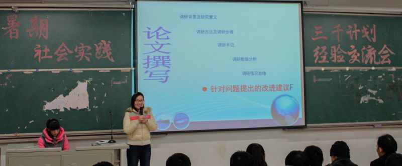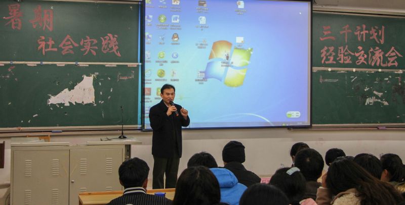 赵宝廷老师作总结发言。他主要介绍了三千计划的目标,即让每一位同学有机会深入社区、企业和农村更多的了解社会,也指出社会实践能让同学们更多的了解自己的家乡,用专业的眼光重新审视自己的家乡。最后他希望每一个同学都能把精力投入到读书和实践中。