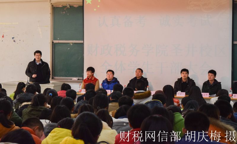 12月25日,财政税务学院“认真备考,诚实考试”全体学生干部大会于圣井校区敏行楼顺利召开。出席此次会议的有财政税务学院党总支书记李玉成、党总支副书记汤长胜、团总支书记王正一、2013级辅导员李建永。2013级、2014级全体学生干部参加了此次大会。