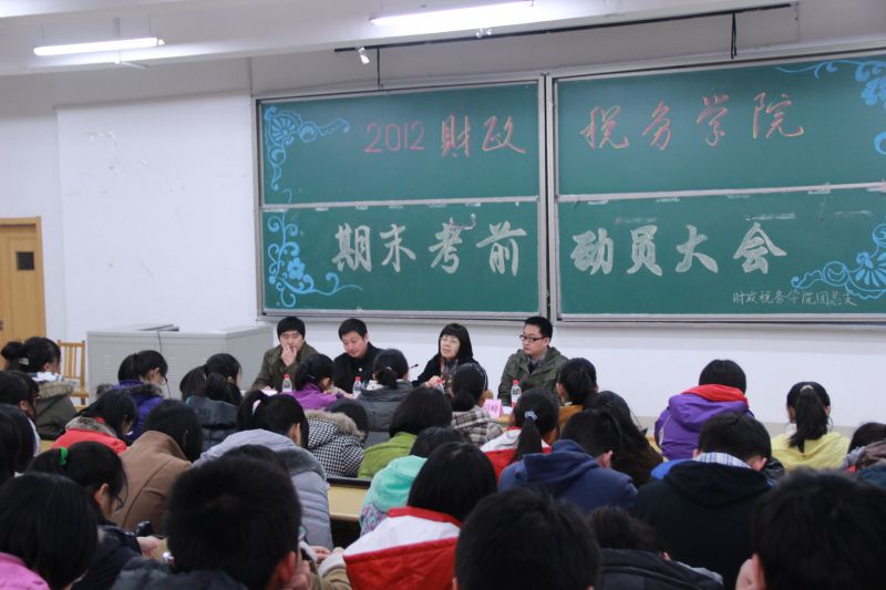 12月20日,财政税务学院“杜绝作弊,从我做起,争创‘三优’班集体”暨期末考前动员大会于山东财经大学圣井校区成功举办。出席本次动员大会的领导老师有:财政税务学院党总支书记潘明星教授、党总支副书记梅丽萍副教授和学院全体辅导员老师。全体2012级同学参与了此次大会。