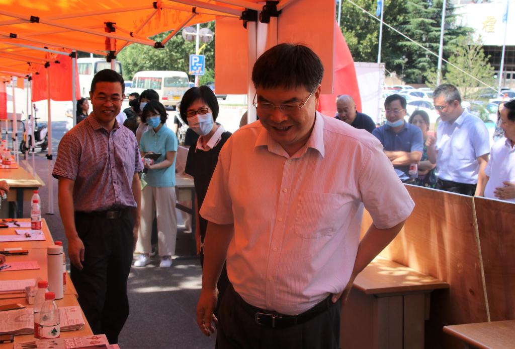 山东财经大学校长赵忠秀、学生处处长王剑等领导的来访视察进一步活跃了迎新工作氛围。领导老师们仔细参观了财政税务学院迎新展板,并对新生们的到来表示真挚的欢迎与祝贺。