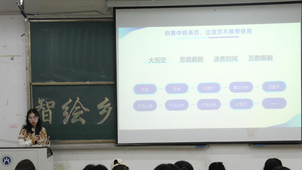 袁雨晴同学围绕PPT制作展开了第二个环节。她认为一份好的PPT可以在尽量短的时间内让评委老师浸入式地了解项目,因此一份制作精良的PPT就显得尤为重要。充足的项目佐证材料和简洁且逻辑性强的排版可以很好地让PPT脱颖而出。另外,袁雨晴还认为创赛PPT中的目录页和过渡页会打断评委的思路和情绪,浪费陈述时间,甚至在页数限制的情况下会减少讲述内容。她推荐以标题栏或侧边栏的形式来代替目录页,同时结合“主标题+副标题”的形式提炼PPT内容,这样不仅可以省去PPT页数,也可以帮助老师快速定位、理解讲述内容。