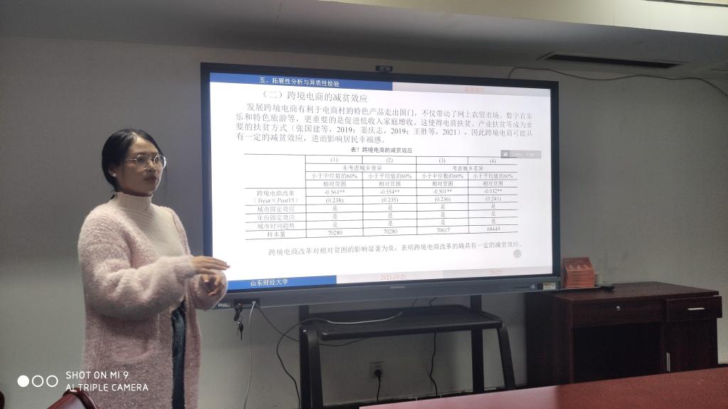 10月21日下午3点半到5点,学院816会议室举行了本学年第8期工作论文研讨会,宋颜群副教授汇报了她的工作论文《跨境电商改革可以提高居民幸福感吗?》。