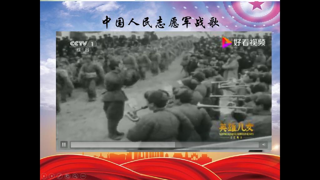 “雄赳赳,气昂昂,跨过鸭绿江……”梅老师铿锵有力地念出《中国人民志愿军战歌》中的歌词。慷慨激昂的乐曲给中国人民志愿军战士带来极强的必胜信念。梅老师在讲解时几度哽咽,她说:“多少十七八岁的小战士就是唱着这首歌背着背包跨过鸭绿江……中国志愿军有将近四十万人牺牲在朝鲜战场。”在场的同学们听到这首歌时也都深有感触,默默地致敬先烈。随后梅老师还和同学们一起欣赏了《英雄赞歌》、《我的祖国》等歌曲。