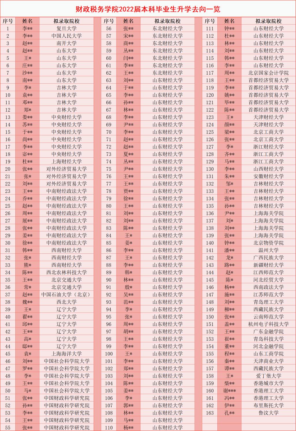 清风传捷报,桃李竞芬芳。随着全国硕士研究生考试录取工作的完成,2022年我院学子喜报频传。截至目前,财政税务学院共有163人被国内外高校拟录取为硕士研究生,再创历史新高。其中45人通过推免途径或统一考试被复旦大学、中国人民大学、南开大学、山东大学、吉林大学、中央财经大学、上海财经大学、对外经济贸易大学等“双一流”建设高校拟录取,占比27.6%;6人升学至爱丁堡大学、香港城市大学、香港理工大学等国(境)外知名高校,占比3.7%。与此同时,我院2022届硕士毕业生中已有两人分别成功考取山东大学和上海财经大学博士研究生。优异成绩的取得,既是我院学子孜孜不倦、奋进拼搏的结果,也是学院注重培养学生的专业素质和职业能力,坚持“提升学”与“促就业”相统一方针,鼓励学生继续深造的成果。