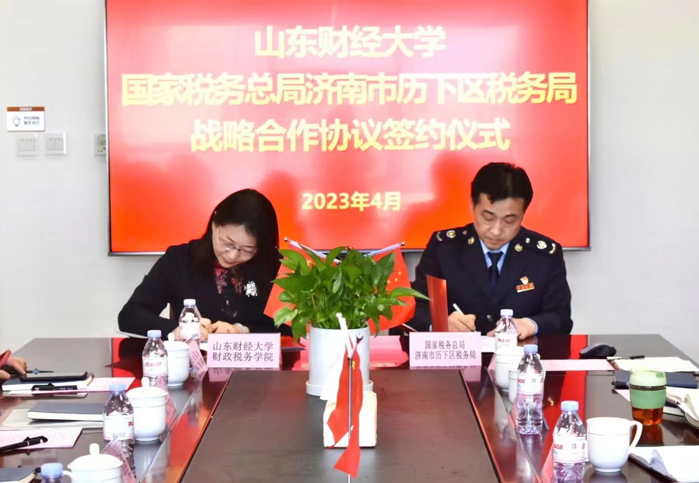 4月7日下午,山东财经大学与国家税务总局济南市历下区税务局战略合作协议签约暨山东财经大学社会实践基地揭牌仪式在历下区政务服务中心举行。财政税务学院党委书记刘波,校团委副书记谷学峰,学院党委副书记张代宝、滕晖,副院长郭健、赵宝廷,税收系主任马静等参加,国家税务总局济南市历下区税务局局长臧军,副局长刘利群、刘耀林等出席。刘利群主持了签约仪式。