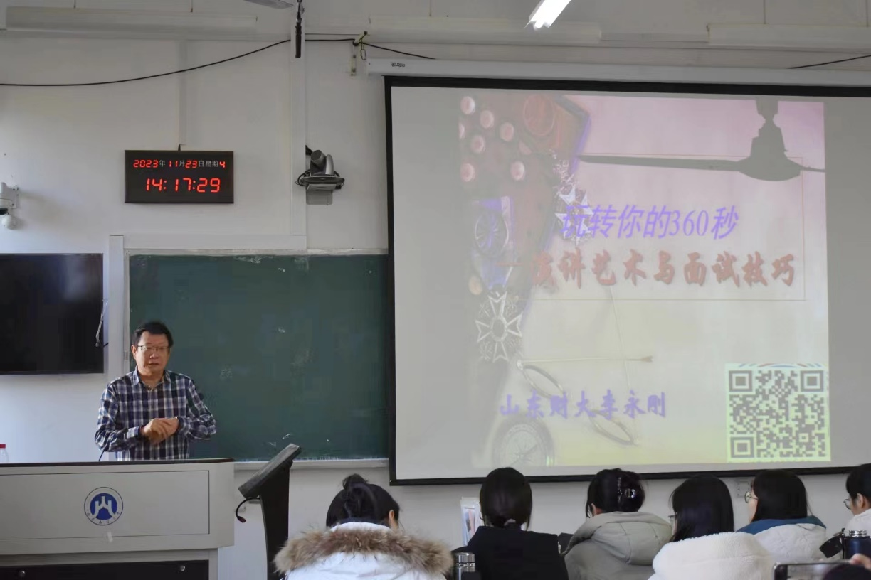 为进一步提升学生就业能力,扎实推进学院就业工作,11月22日,学院于舜耕校区2404教室举办“玩转你的三百六十秒——演讲与面试艺术”专家讲座。山东财经大学教授、山东省演讲学会常务理事兼人才培养委员会主任李永刚应邀主讲,学院党委副书记张代宝,研究生辅导员王正一出席讲座,舜耕校区2023级研究生参加讲座。