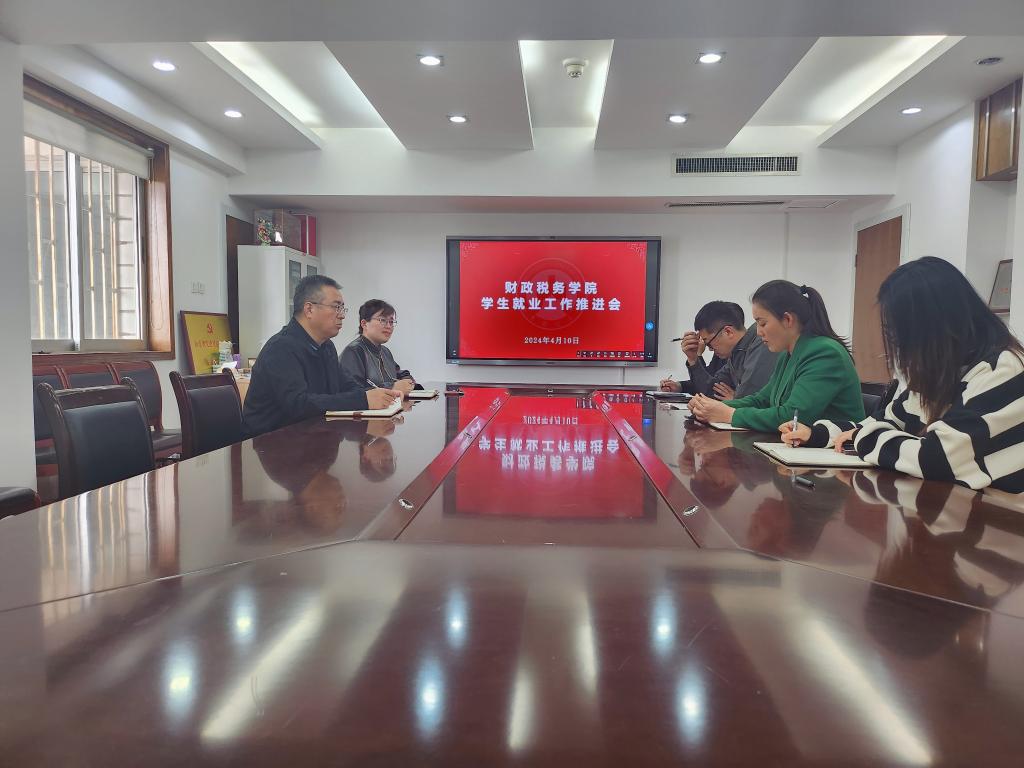 4月10日下午,财政税务学院在舜耕校区办公楼708会议室召开学生就业工作推进会议。学院党委副书记张代宝、滕晖出席会议。就业办主任李峻汝,2024届毕业班辅导员王正一、曹同锋、李子云参加会议。会议由滕晖主持。