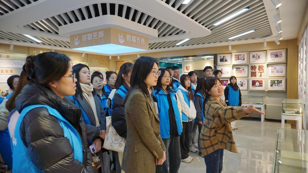 随后,志愿者们分为两组走进特殊教育的课堂。一组志愿者与听障学生同上一堂语文课,两校学生热情互动,互相介绍,课堂气氛活跃。志愿者们耐心地辅助听障学生参与课堂活动,听障学生也通过简单的手语向志愿者们表达了感谢。课堂结束后,听障学生带领志愿者们学习手语歌《国家》,并合影留念。