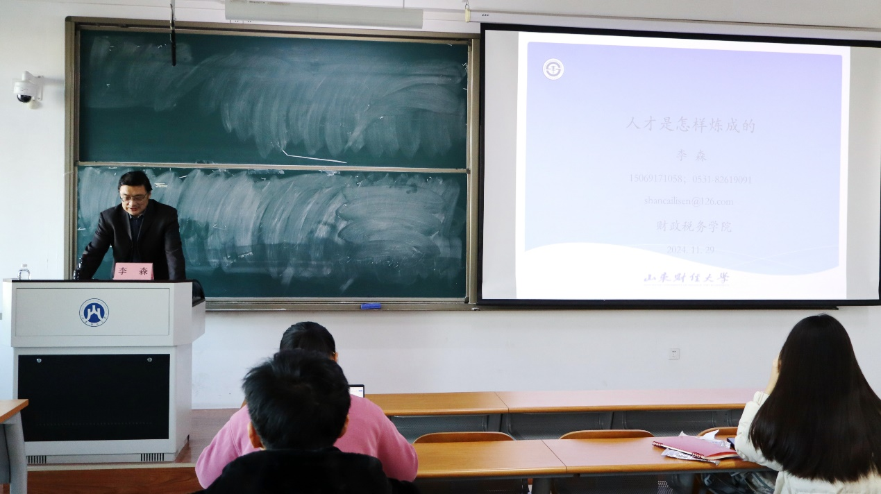 为帮助学生提高自我培养意识,明确未来发展方向,实现个人全面发展,11月29日,财政税务学院成长 · 成才大讲堂于圣井校区七号楼举行。本次讲座的题目为“人才是怎样炼成的”,由财政税务学院李森院长主讲,我院部分学生参加。