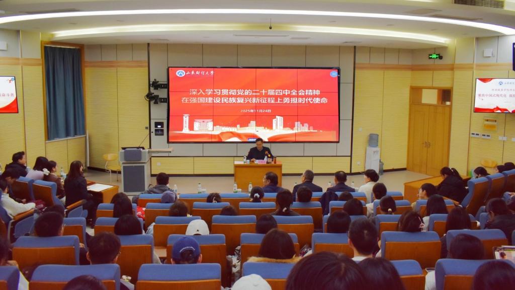 “王校长的宣讲,让我对全会精神的时代内涵与实践要求有了系统性认识。作为新时代青年学子,我将把个人理想融入国家发展大局,努力在强国建设、民族复兴的新征程上展现青春风采”,2023级财政专业本科生亓笑阳这样说。