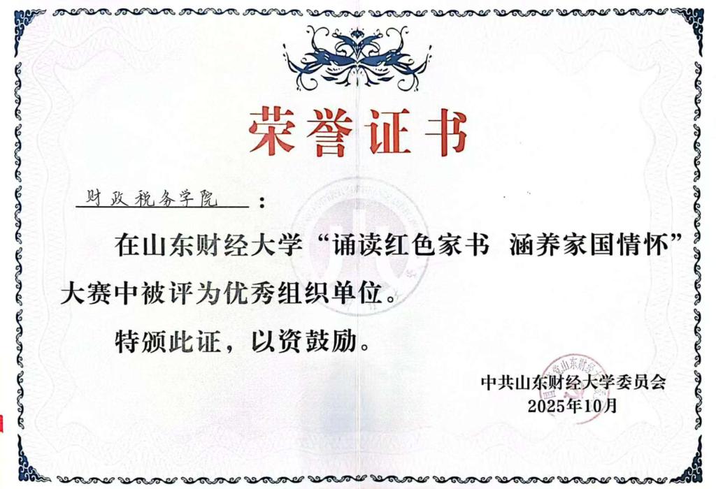 11月13日,山东财经大学第二届“诵读红色家书 涵养家国情怀”大赛于章丘校区文化活动中心举行。财税学子积极参与,以深情诵读重温峥嵘岁月,感悟初心使命。此次比赛,我院荣获“优秀组织单位”称号,两组同学荣获二等奖。