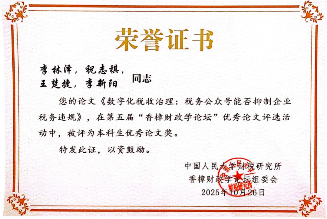 10月26日,以“十五五时期的财税体制改革”为主题的第五届香樟财政学论坛在中国人民大学召开。本次论坛由中国人民大学财政金融学院、香樟经济学术平台主办,中国人民大学财税研究所承办。本届论坛共评选出2篇优秀本科论文奖论文,其中,我院税收学23级本科生李林泽以第一作者身份荣获第五届“香樟财政学论坛”本科生优秀论文奖。