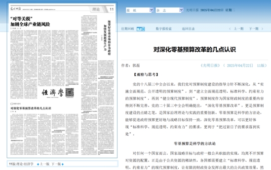 我院郭磊教授在《光明日报》理论版(2025-04-22)发表题为《对深化零基预算改革的几点认识》的文章。《光明日报》系中央“三报一刊”,该文章属我校A2类权威成果,并被学习强国平台全文转载。