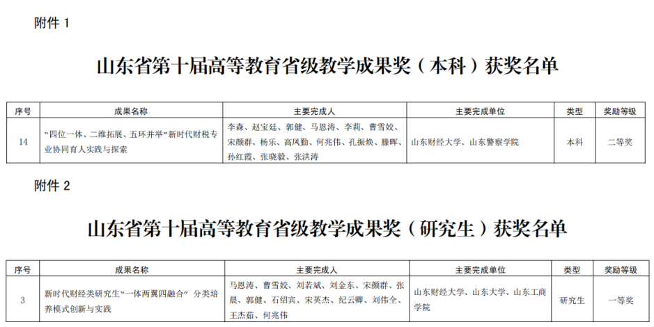 近日,山东省教育厅印发《第十届高等教育省级教学成果奖获奖名单的通知》(鲁教高函〔2025〕30号),我院新获得两项教学成果奖。其中,马恩涛教授主持的《新时代财经类研究生“一体两翼四融合”分类培养模式创新与实践》荣获研究生教学成果一等奖,李森教授主持的《四位一体、二维拓展、五环并举”新时代财税专业协同育人实践与探索》荣获本科教学成果二等奖。
