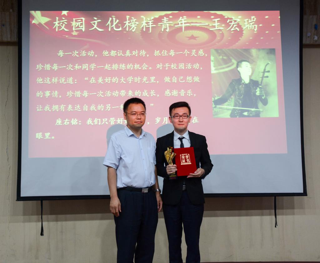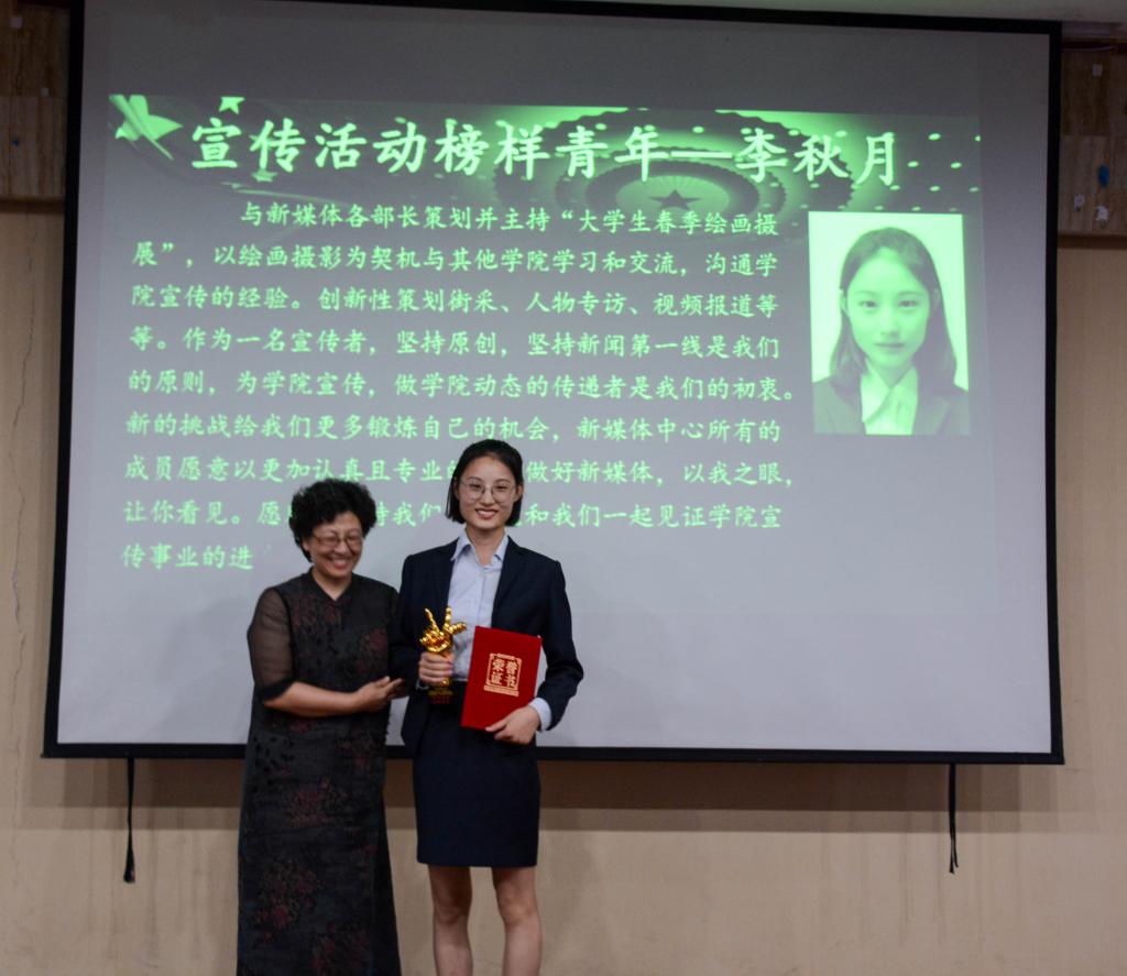 随后,李福小学支教志愿服务团队获得“志愿服务榜样团队”奖项。李福小学支教活动由学生会社团部承办,多年来他们坚持参与校内外的志愿公益活动,尽自己所能为他人、社会提供献爱心活动,并以实际行动感染了周围同学,获得了老师、同学们的肯定。接下来颁发的是“校园文化榜样青年”奖项,获奖者为2015级税收学六班的王宏瑞,他积极参与并组织了各项艺术活动,在文体活动中起到了良好的模范带头作用,在丰富同学们课余生活的同时也提高了自己。第八项颁发的是“宣传活动榜样青年”奖项。获奖者是2016级税收学四班的李秋月,她在个人视频中表达了对宣传的热爱和她将带领新媒体中心所有成员以更加努力且专业的态度做好宣传工作的决心。